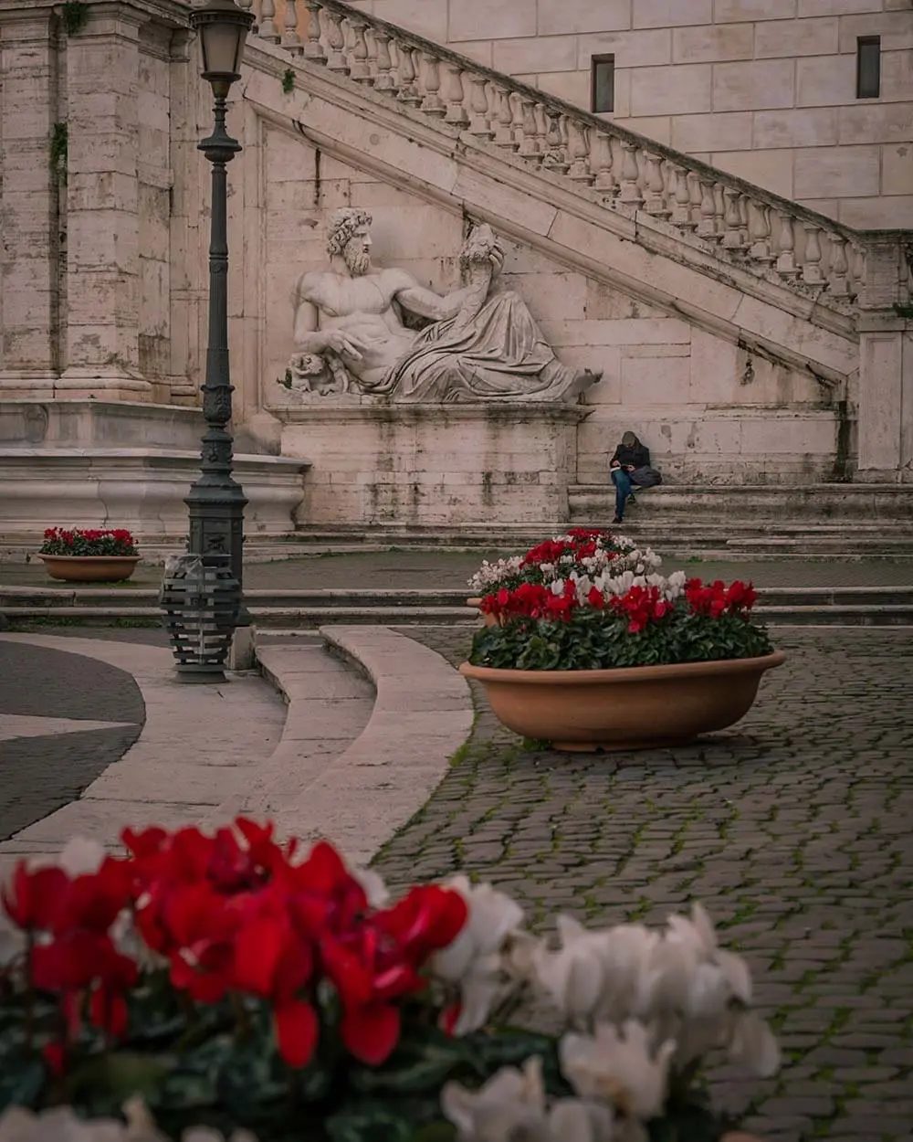 Tre edifici nobili delimitano lo spazio: il maestoso Palazzo Senatorio, sede del Comune di Roma; il Palazzo dei Conservatori e il Palazzo Nuovo, che formano il nucleo dei Musei Capitolini. Al centro della pavimentazione stellata domina la copia della statua equestre dell’imperatore Marco Aurelio, simbolo del potere imperiale e civico.