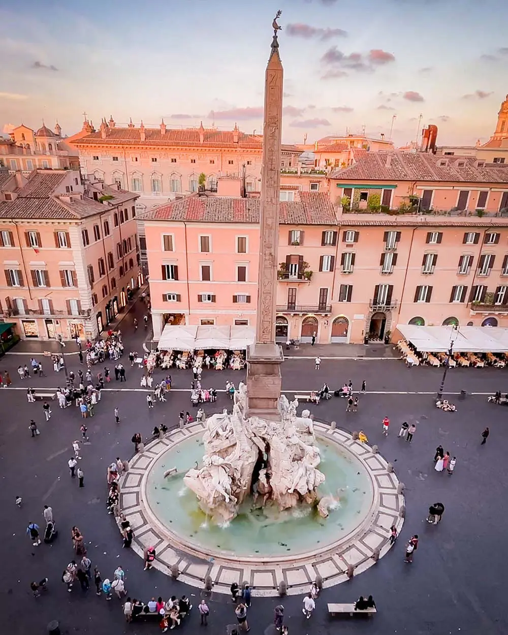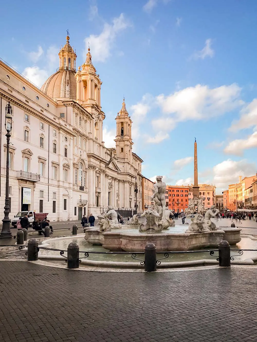 Oggi, la piazza è celebre per le sue splendide fontane barocche, tra cui spicca la Fontana dei Quattro Fiumi, capolavoro di Gian Lorenzo Bernini. Questa imponente opera rappresenta i quattro grandi fiumi del mondo – Nilo, Gange, Danubio e Rio della Plata – attraverso figure allegoriche che si intrecciano attorno a un obelisco centrale.