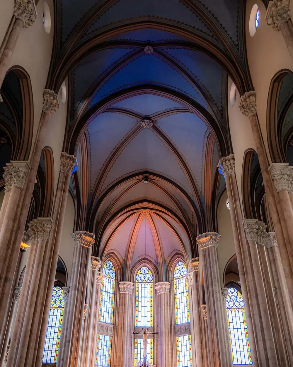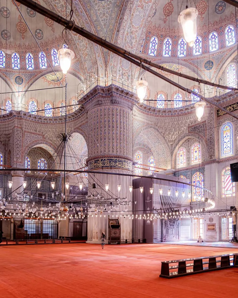 All’interno, la moschea prende il nome dalle oltre 20.000 piastrelle di ceramica provenienti da Iznik, decorate con disegni floreali nelle tonalità del blu e del verde. Queste piastrelle danno vita a motivi floreali e geometrici che richiamano la natura e simboli islamici. La luce filtra attraverso le oltre 200 vetrate colorate, creando un’atmosfera suggestiva che esalta i toni delicati dell’interno e dona alla moschea il suo inconfondibile “bagliore blu”.
