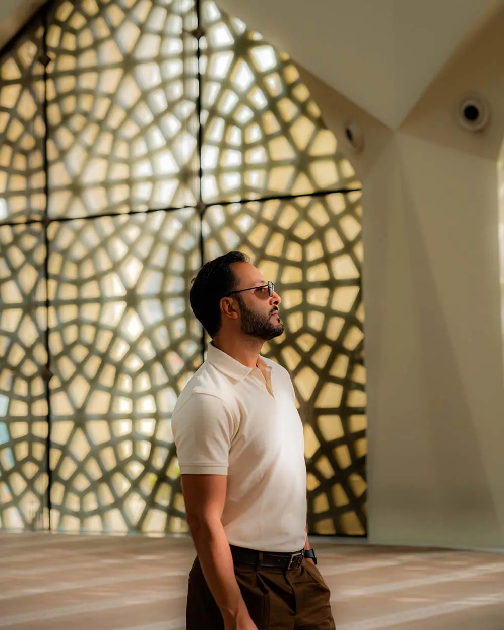 La moschea è caratterizzata da una grande cupola centrale, ampie vetrate che lasciano entrare la luce naturale e un minareto imponente. L’interno è decorato con eleganza, rispecchiando un’atmosfera luminosa e accogliente ideale per la preghiera e la meditazione.