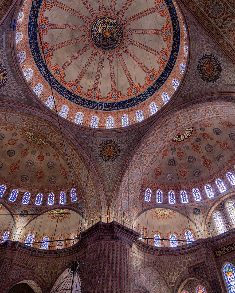 L’architettura della Moschea Blu è uno straordinario esempio dell’arte ottomana, con influenze bizantine e islamiche che si intrecciano in un’armonia unica. Inoltre la moschea è famosa per i suoi sei minareti, una particolarità insolita per l’epoca, e per la cupola centrale alta circa 43 metri, sostenuta da quattro enormi pilastri chiamati “zampe di elefante”.
