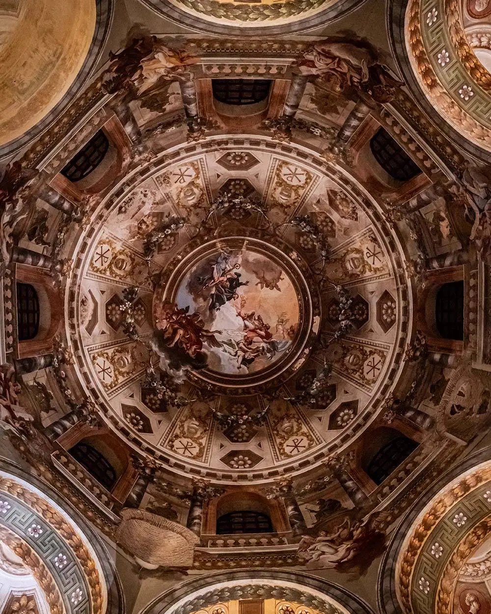 Al centro della maestosa cupola, emerge un immenso cielo stellato, incorniciando la croce latina dorata in tutto il suo splendore, simbolo di Cristo Sole Nascente. I quattro Esseri dell’Apocalisse circondano la croce con un’eleganza solenne, acclamando la figura sacra al centro. Le lunette circostanti sono abbellite dagli apostoli, circondati da colombe e zampilli d’acqua, rappresentando la Grazia che fluisce dalla Fonte Divina.