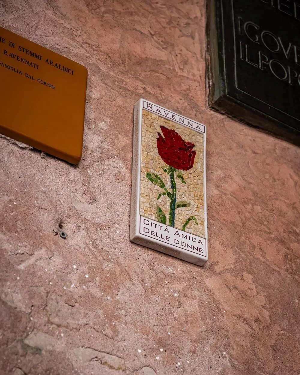 Durante la tua passeggiata per il centro storico di Ravenna, se osservi i civici di alcune palazzine noterai diverse mattonelle in stile mosaico che raffigurano dei fiori.