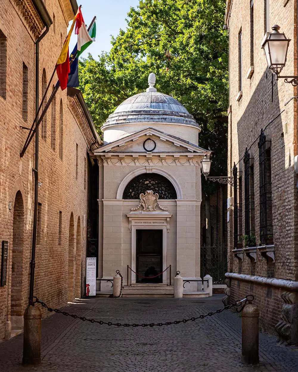 Prosegui la tua passeggiata fino a raggiungere la tomba di Dante, il monumento nazionale dedicato al poeta che visse e morì nella città romagnola nel 1321. La tomba è situata vicino alla Basilica di San Francesco, dove si svolsero i funerali del Sommo Poeta.
