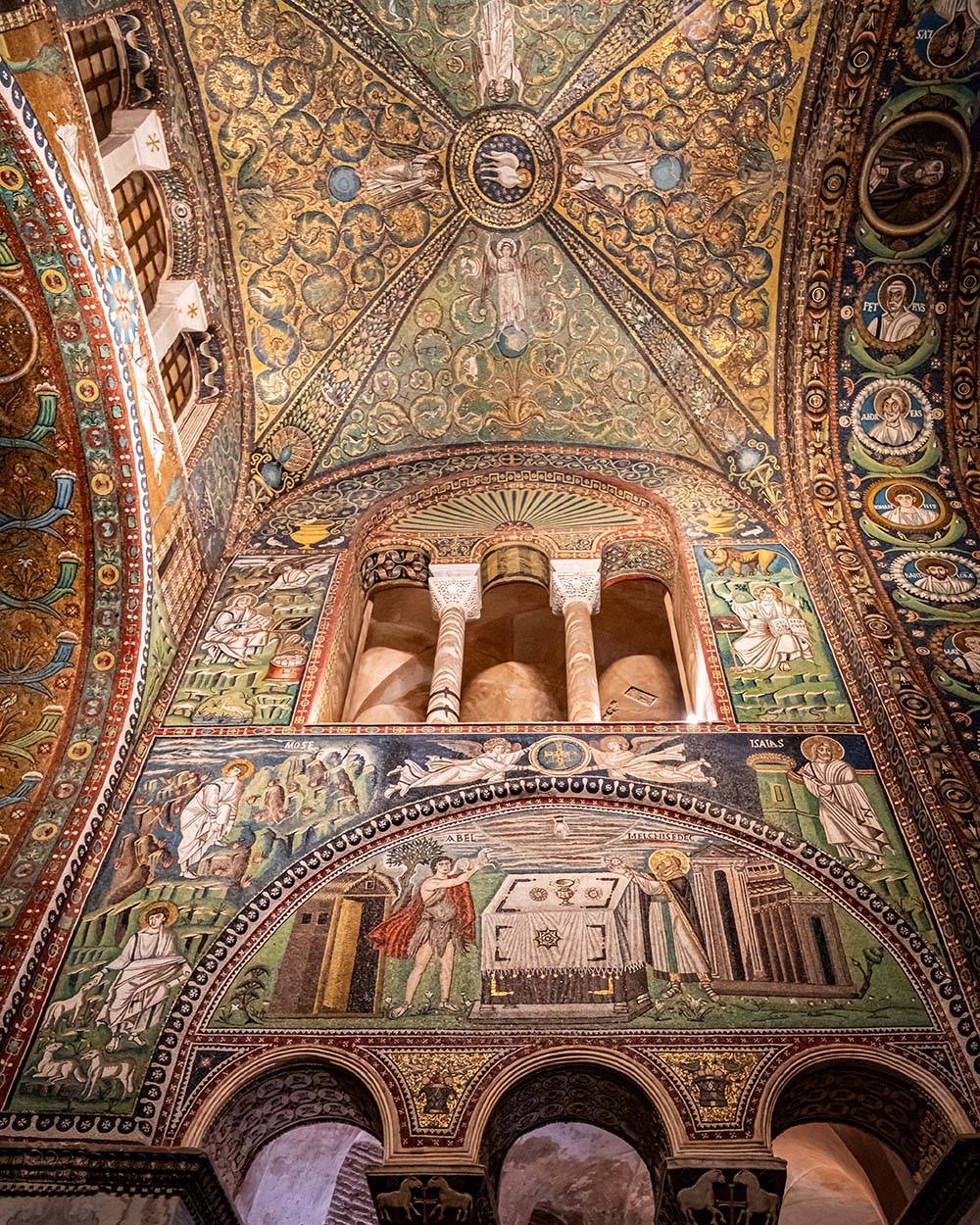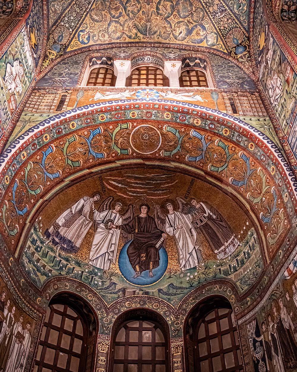 Uno splendido esempio di mosaico parietale con uno sviluppo verticale conferisce all’edificio un’aura imperiale e rappresentativa del potere politico e religioso dell’epoca. Nel presbiterio, i personaggi tratti dall’Antico e Nuovo Testamento sono plastici e in un contesto terreno, mentre nell’abside, le figure (imperatori, arcivescovi) si stagliano su uno sfondo aureo, trasmettendo energia trascendente e metafisica della Chiesa e la forza dogmatica e politica di Giustiniano.