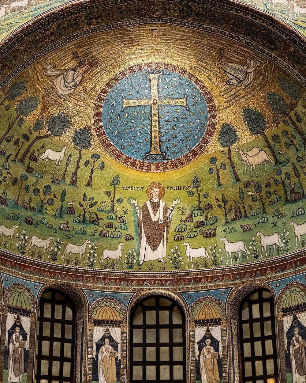 Al di sopra del paesaggio paradisiaco con Sant’Apollinare emerge la mano di Dio e una croce tempestata di pietre preziose. Nel catino absidale, il volto di Cristo con le lettere apocalittiche dell’alfabeto greco, l’Alpha e l’Omega.