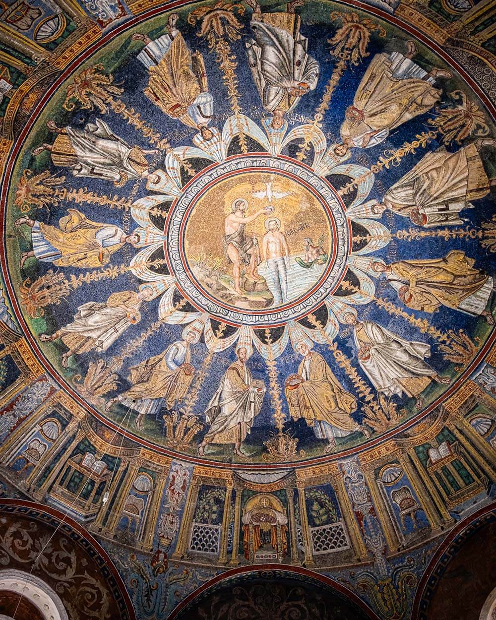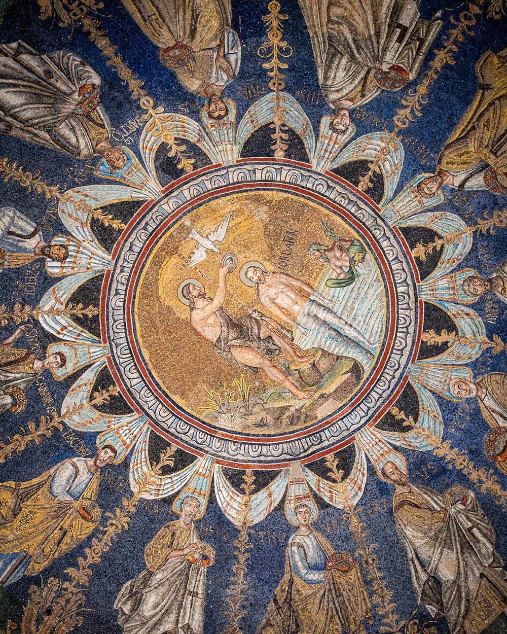 Il mosaico del battesimo è considerato di età teodoriciana, mentre gli apostoli furono rifatti nel VI secolo.