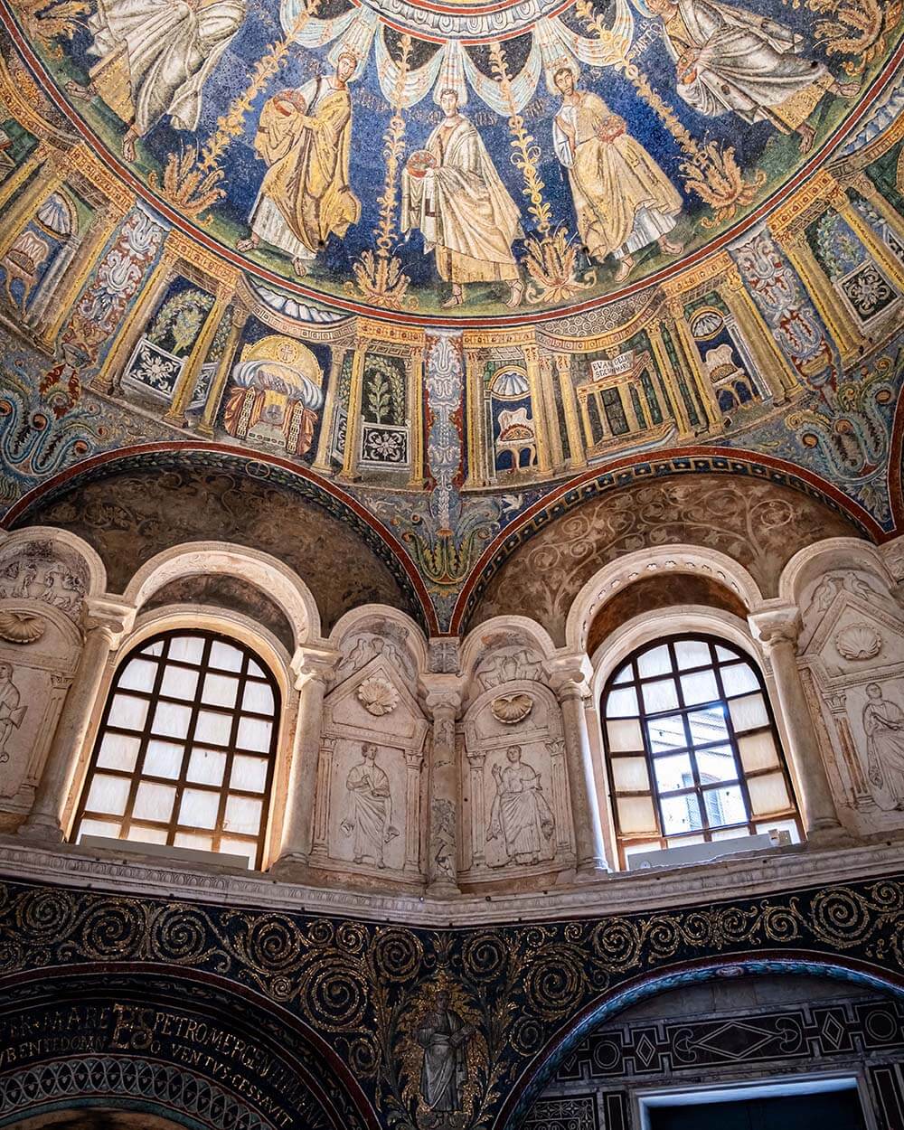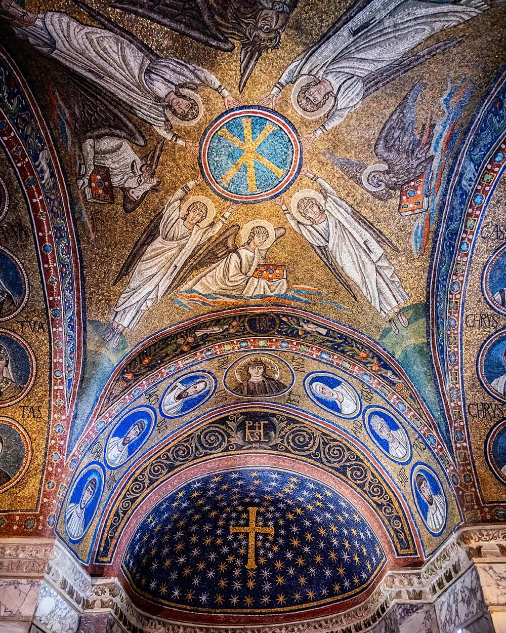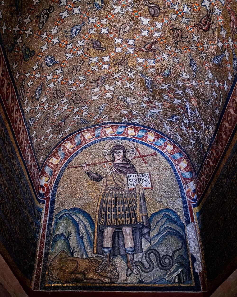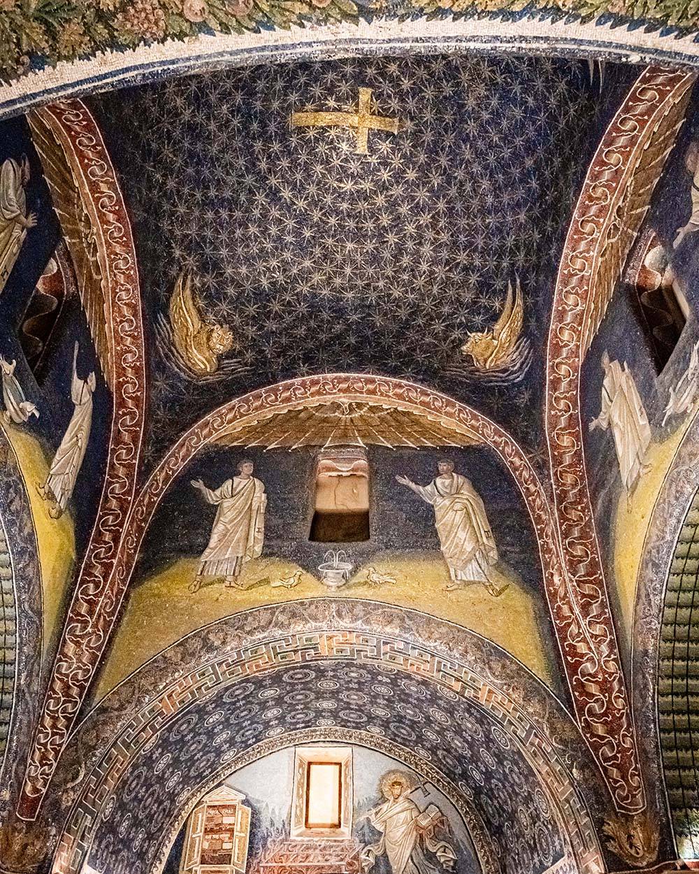 Entrando all’interno, si è rapiti dall’atmosfera magica creata dai mosaici dorati, che coprono pareti, archi, lunette e cupola. I temi iconografici rappresentati si sviluppano intorno alla vittoria della vita eterna sulla morte, con simboli cristiani e figure come la croce latina dorata e gli apostoli.