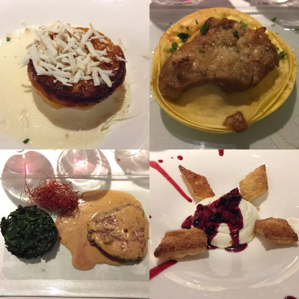 Fiori di zucca su fonduta di formaggio Montasio DOP; Lasagnetta croccante ai porcini; Sorbetto; Filetto di manzo al pepe rosa con tortino di spinacine fresche; Cialde di sfoglia con crema Chantilly e frutti di bosco.