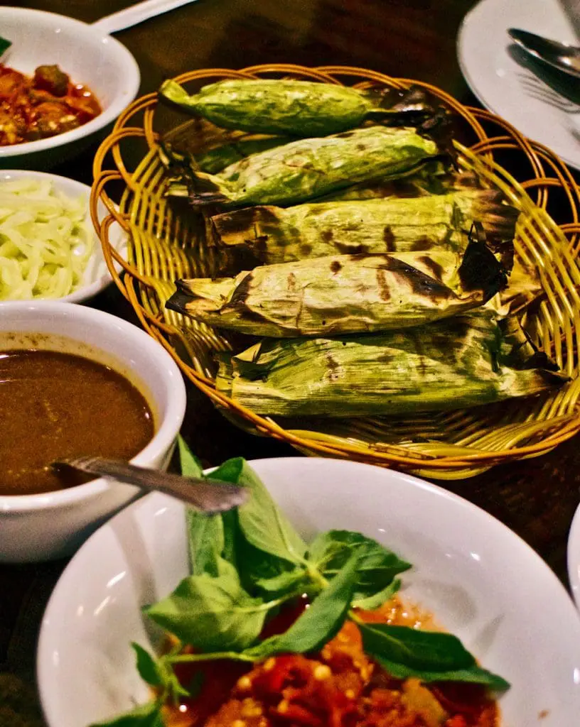 Tuing-Tuing è un piatto fatto a base di uova di pesce servito con aceto e scalogno. Otak-Otak è un involtino di pesce avvolto in una foglia di banana e arrostito sul carbone.
